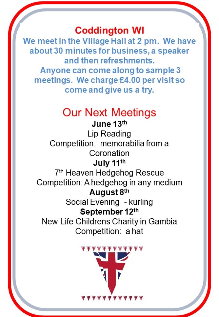 Our next meeting is on 11th June when our guest speaker will be from Beaumond House. You are most welcome to come along as a guest for 2.00 pm in Coddington Village Hall.